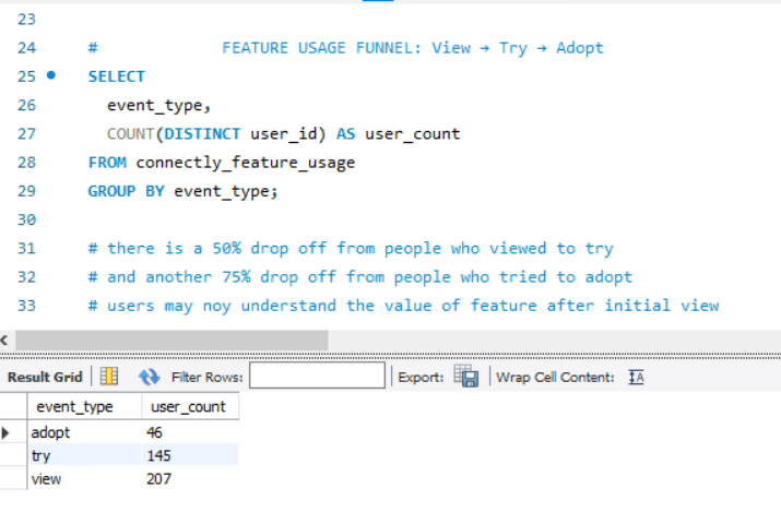 Funnel drop-off | Major drop-offs from view → try → adopt |