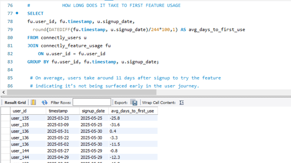 Insight: Most users (~92%) never interact with the feature; on average, most users discover the feature after 11 days post-signup.